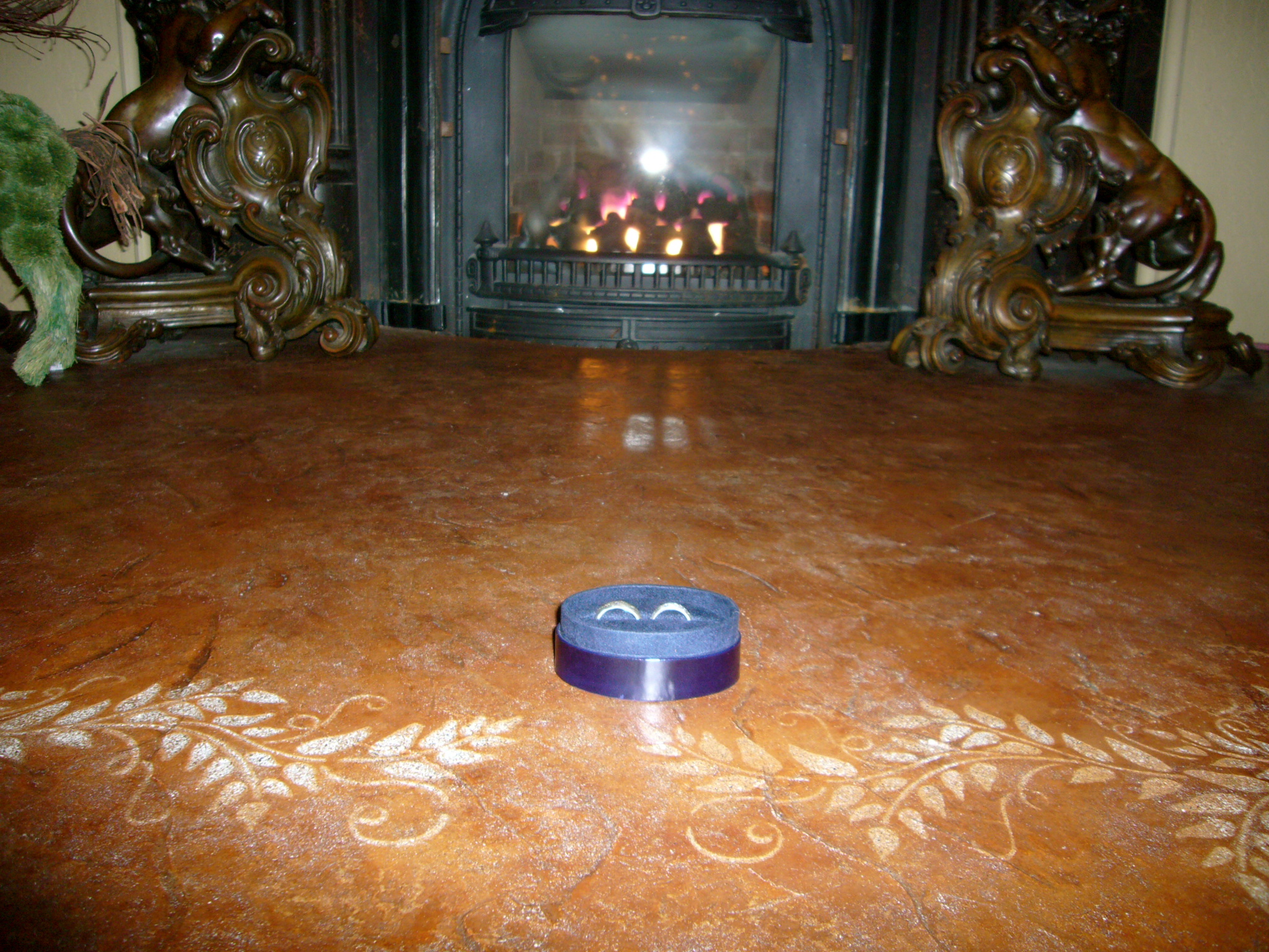| We were married in front of the Villa's hearth, shown here with the rings front and center. |